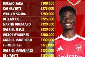 萨卡30万镑顶薪!阿森纳周薪:赖斯22.5万、加布15万、道曼350镑
