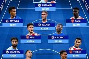中场:赖斯(阿森纳,1.2亿)、帕尔默(切尔西,1.2亿)、凯塞多(切尔西,1.1亿)