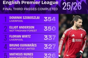 英超进攻三区成功传球榜:索博居首 维尔茨、B费、赖斯、恩佐在列