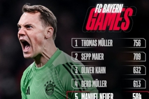 体育资讯1月19日讯 拜仁官方晒出海报,诺伊尔为球队584次出场已经追平贝肯鲍尔并列第5,具体榜单如下: